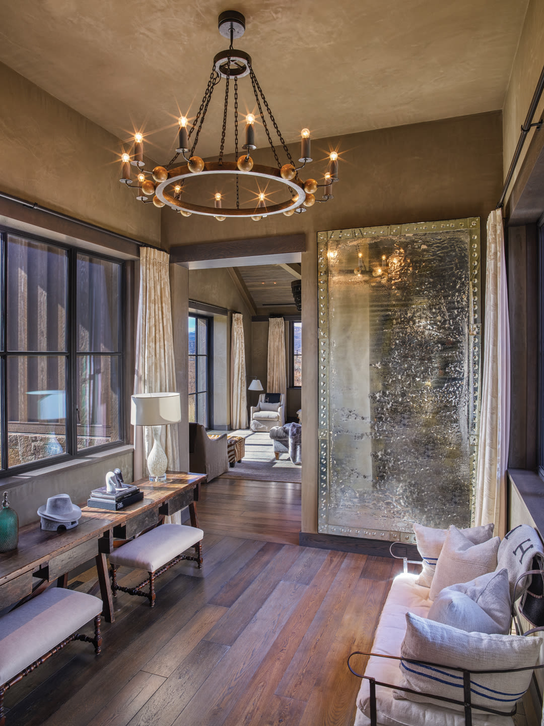 The work of local craftsmen is also evident throughout, including the oversize hood in the kitchen fabricated by Paonia Iron Works and, in the family and dining rooms, a set of iron light fixtures accented by straps of tooled leather that were designed by Basalt-based Myers and Company. A custom carved-marble vanity in the master bath sits side by side with imported tile that was jetted with water upon installation to deter any odd breaks from occurring in the intricate design.