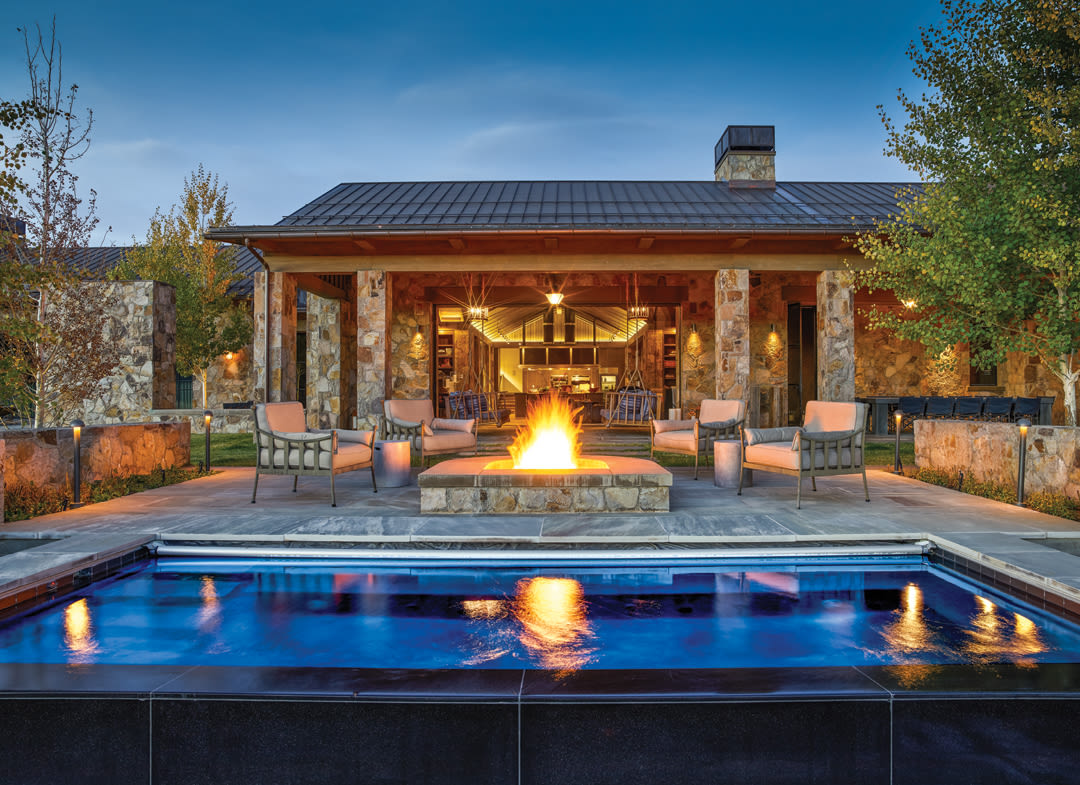 But the kitchen can also take on a different persona. The fantastical panorama of mountains and sky visible through floor-to-ceiling windows is enough to make this space a respite for days at a time. Waves of tawny meadow grass merge with the meandering lines of Owl Creek Road in the distance as it disappears into the horizon. Just outside the family room, sofa-size swings hang on either side of the sliding glass doors, under the protective cover of a large veranda, while, farther afield, a fire pit beckons for late-night marshmallow roasts under the stars. To the side, a fireplace illuminates an intimate dining area, one of the many outdoor “rooms” that seem to serendipitously appear around the home’s exterior.